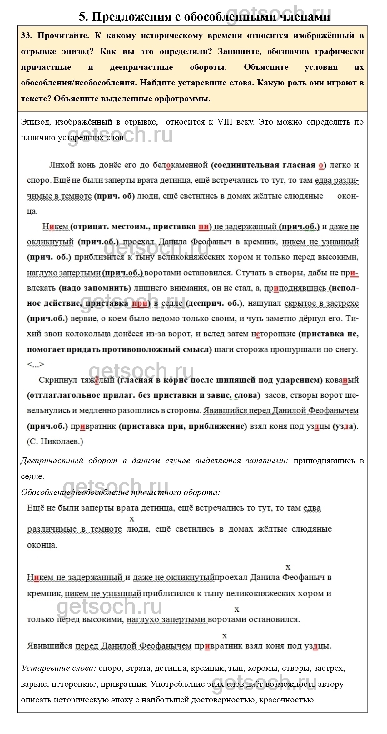 33. Прочитайте. К какому историческому времени относится изображённый в отрывке эпизод? Как вы это определили? Запишите, обозначив графически причастные и деепричастные обороты. Объясните условия их обособления/необособления. Найдите устаревшие слова. Какую роль они играют в тексте? Объясните выделенные орфограммы.