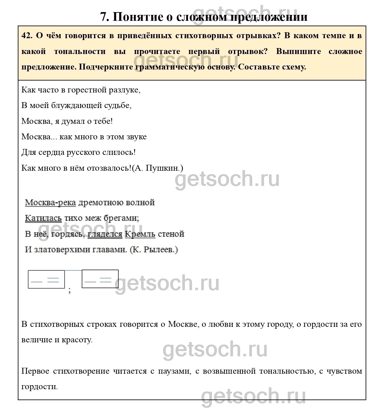 42. О чём говорится в приведённых стихотворных отрывках? В каком темпе и в какой тональности вы прочитаете первый отрывок? Выпишите сложное предложение. Подчеркните грамматическую основу. Составьте схему.