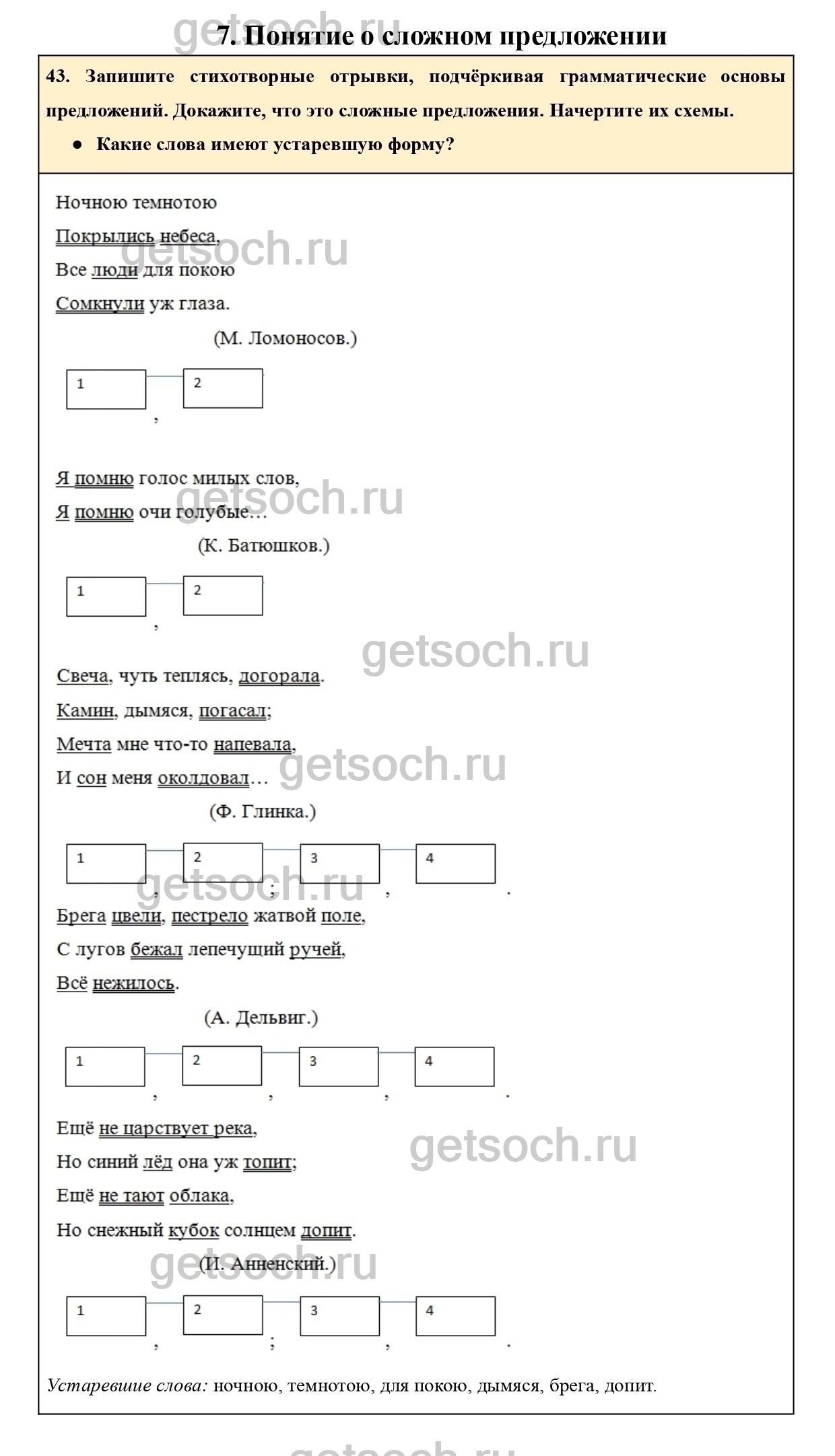 43. Запишите стихотворные отрывки, подчёркивая грамматические основы предложений. Докажите, что это сложные предложения. Начертите их схемы.