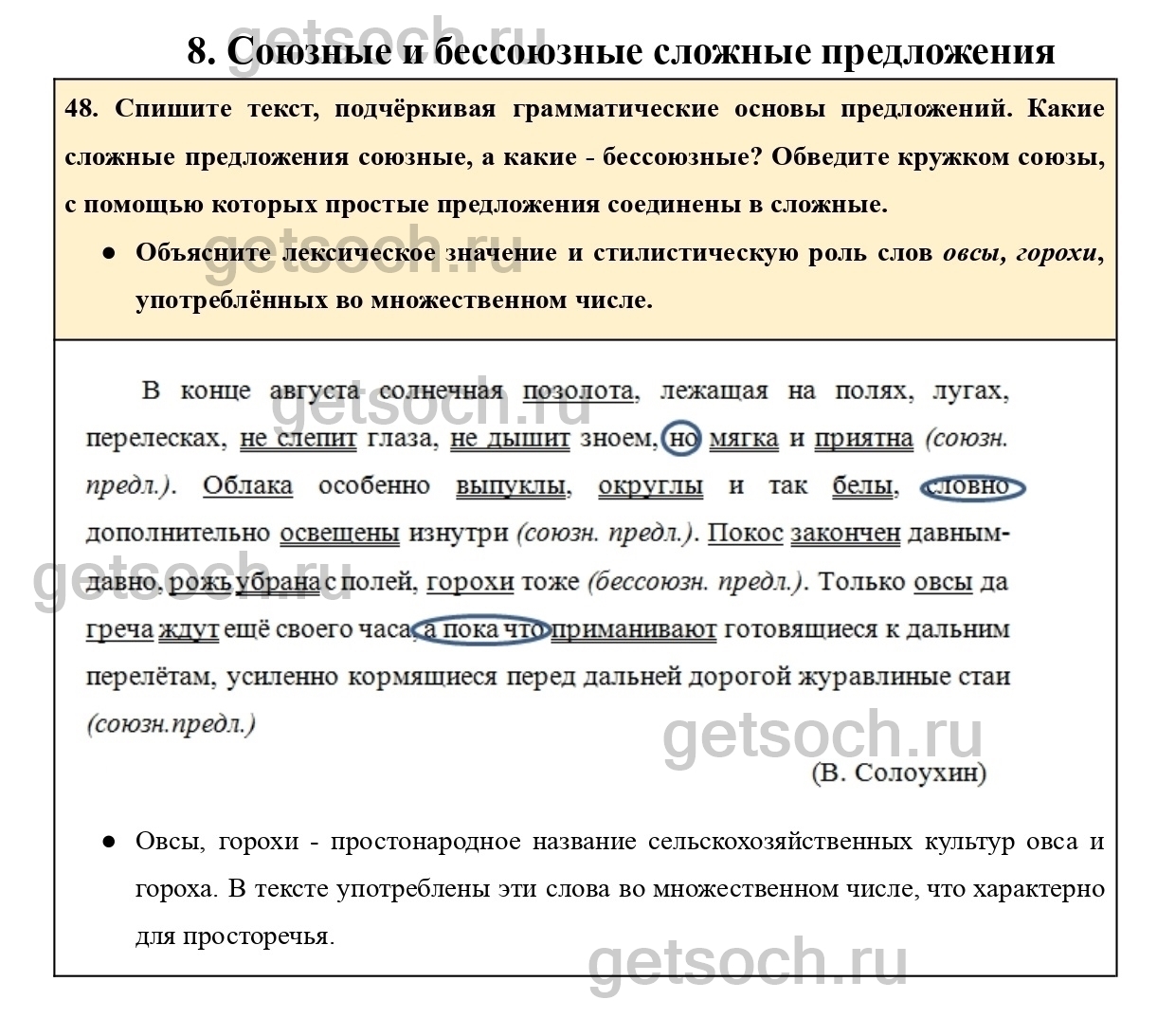 48. Спишите текст, подчёркивая грамматические основы предложений. Какие сложные предложения союзные, а какие – бессоюзные? Обведите кружком союзы, с помощью которых простые предложения соединены в сложные.
