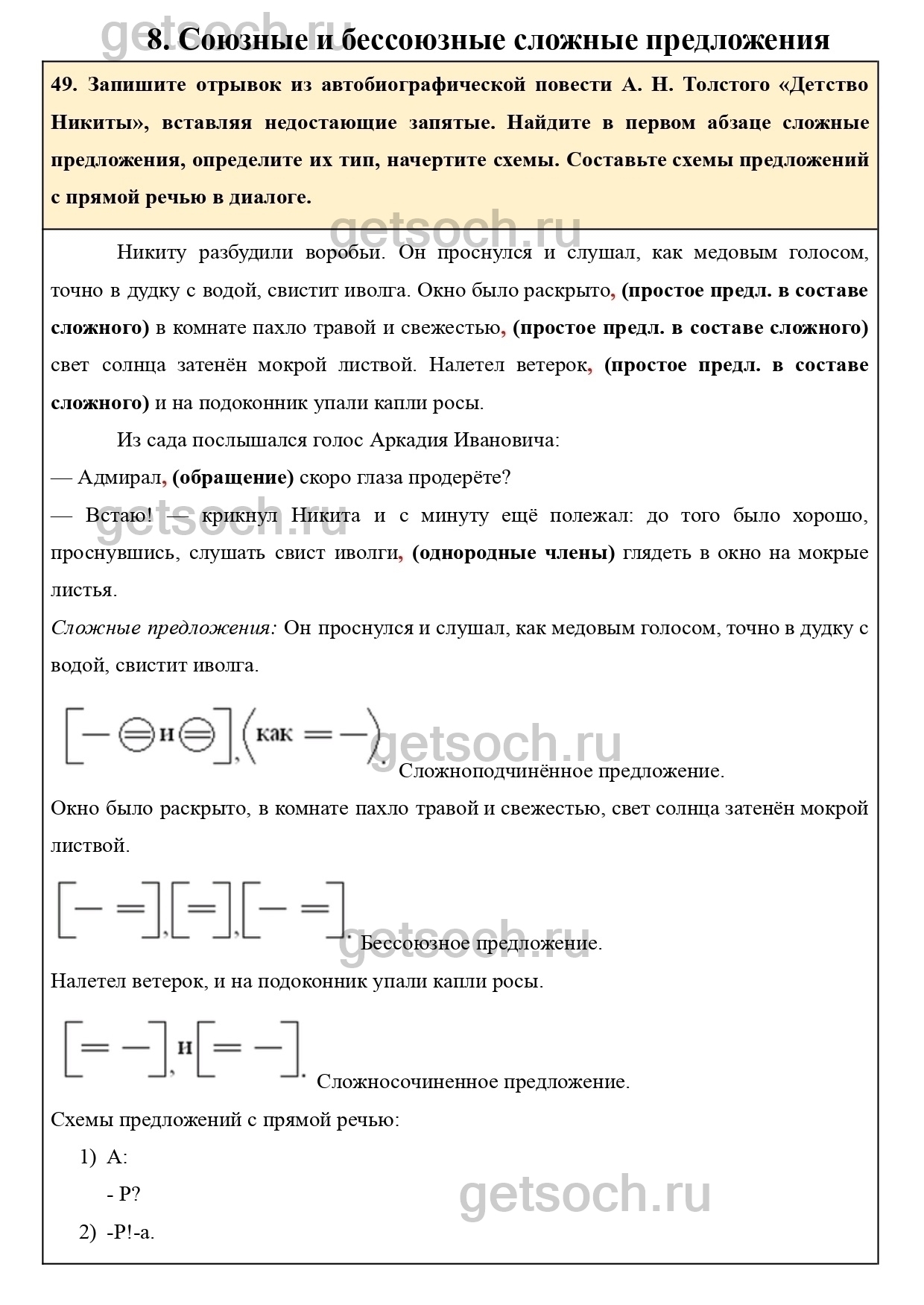 49. Запишите отрывок из автобиографической повести А. Н. Толстого «Детство Никиты», вставляя недостающие запятые. Найдите в первом абзаце сложные предложения, определите их тип, начертите схемы. Составьте схемы предложений с прямой речью в диалоге.
