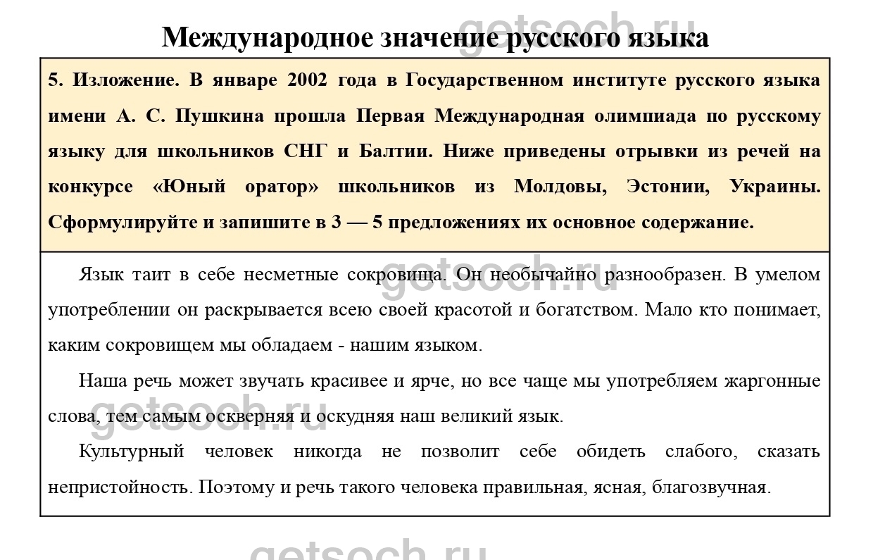 5. Изложение. В январе 2002 года в Государственном институте русского языка имени А. С. Пушкина прошла Первая Международная олимпиада по русскому языку для школьников СНГ и Балтии. Ниже приведены отрывки из речей на конкурсе «Юный оратор» школьников из Молдовы, Эстонии, Украины. Сформулируйте и запишите в 3 — 5 предложениях их основное содержание.