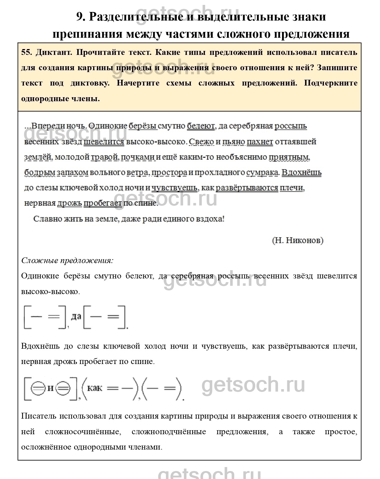 55. Диктант. Прочитайте текст. Какие типы предложений использовал писатель для создания картины природы и выражения своего отношения к ней? Запишите текст под диктовку. Начертите схемы сложных предложений. Подчеркните однородные члены.