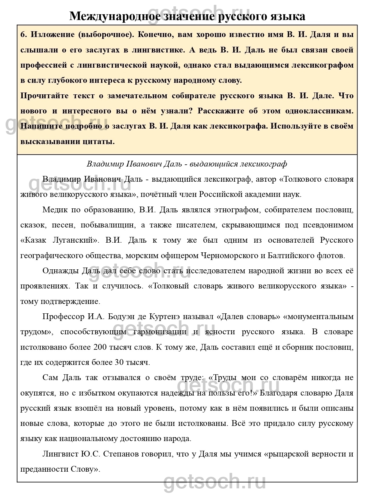 6. Изложение (выборочное). Конечно, вам хорошо известно имя В. И. Даля и вы слышали о его заслугах в лингвистике. А ведь В. И. Даль не был связан своей профессией с лингвистической наукой, однако стал выдающимся лексикографом в силу глубокого интереса к русскому народному слову.