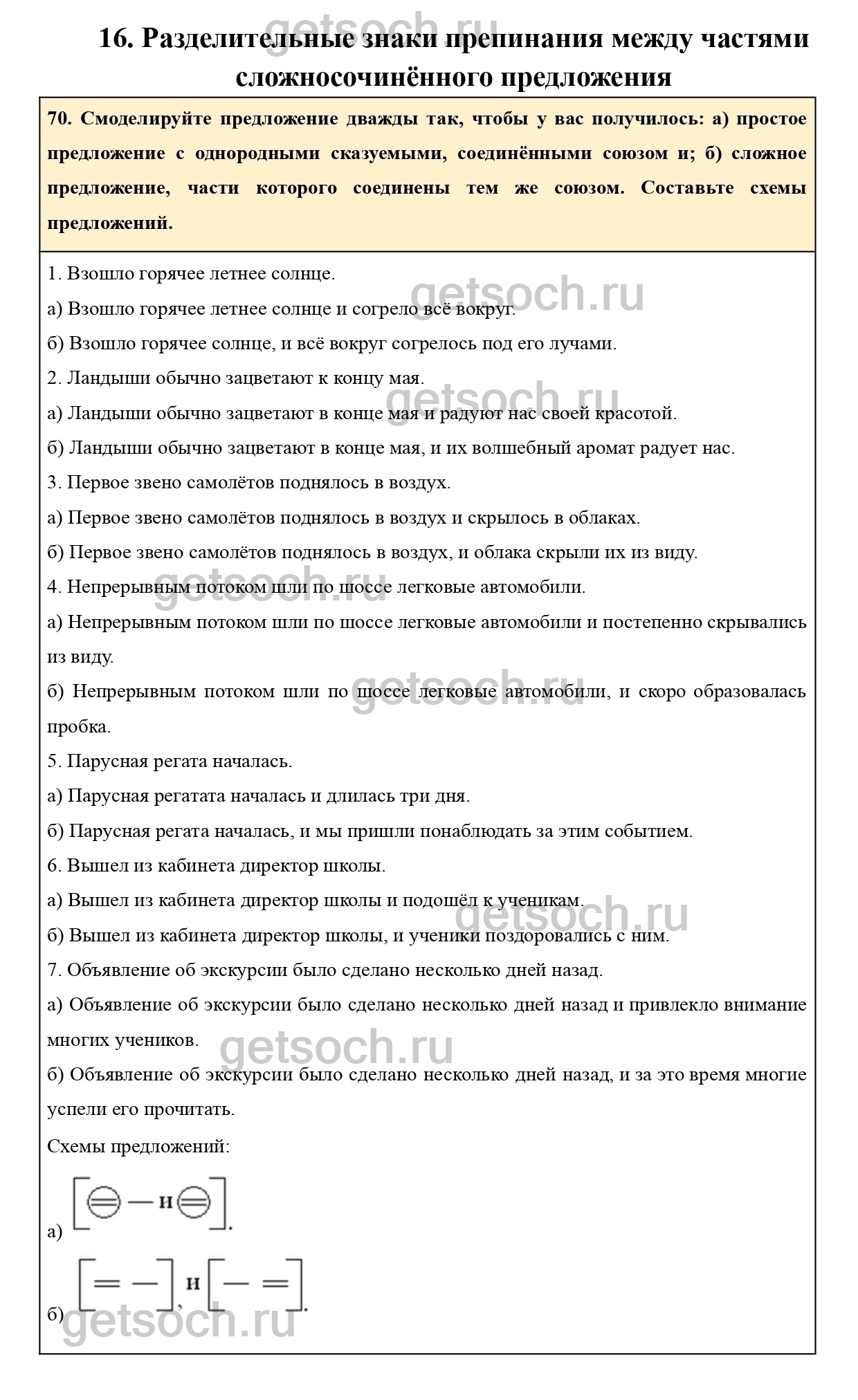 70. Смоделируйте предложение дважды так, чтобы у вас получилось: а) простое предложение с однородными сказуемыми, соединёнными союзом и; б) сложное предложение, части которого соединены тем же союзом. Составьте схемы предложений.