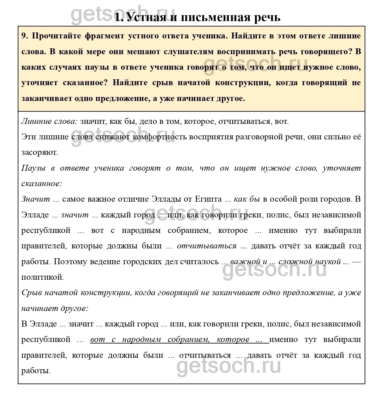 9. Прочитайте фрагмент устного ответа ученика. Найдите в этом ответе лишние слова. В какой мере они мешают слушателям воспринимать речь говорящего? В каких случаях паузы в ответе ученика говорят о том, что он ищет нужное слово, уточняет сказанное? Найдите срыв начатой конструкции, когда говорящий не заканчивает одно предложение, а уже начинает другое.