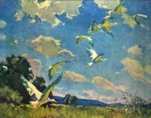 Важно отметить, что Тихий великолепно передал реалистичные детали аистов, которые выглядят гордо и величественно, в разных фазах взмаха крыльев. Кроме того разные расстояния между птицами на картине, а также облачко, закрывшее солнце, создают динамику и чувство движения в произведении.