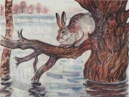 Заяц, являясь одним из наиболее уязвимых животных в этой ситуации, был вынужден проявить смекалку и находчивость, чтобы выжить. Его хитрость и умение выживать в трудных условиях отражены на картинах очень точно и выразительно. Он устроился на ветке так, чтобы вода не смогла достать его, и прижался к стволу дерева, прислушиваясь к каждому шуму.