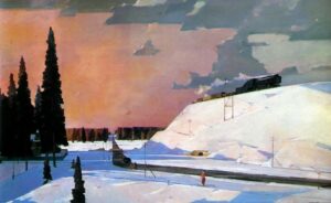 На картине можно увидеть лыжника в красной куртке, который наслаждается зимой. Рядом с ним проезжает машина, а на вершине горы быстро промчался товарный поезд, выпуская облака пара. Художник также подчеркивает гармонию, существующую между цивилизацией и природой, показывая, как дорога плавно вливается в лесной массив, а часовня уютно располагается среди огромных деревьев.