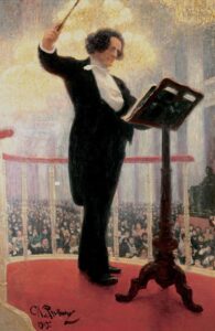 Антон Рубинштейн изображен на полотне в полный рост. Он стоит на балконе, повернувшись лицом к невидимому оркестру. Взгляд дирижера наполнен концентрацией и силой, а рука с дирижерской палочкой энергично взметнута в воздухе. Вся его поза говорит о его мастерстве и уверенности в своих способностях. Лицо Рубинштейна отражает его гениальность и пронзительный взгляд, заставляющий нас замирать.
